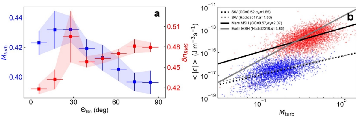 图3,(a)火星磁鞘湍动马赫数和密度扰动幅度随激波法向角的分布。(b)火星弓激波上游太阳风和下游磁鞘可压缩湍流能量串级率随湍动马赫数的统计分布。