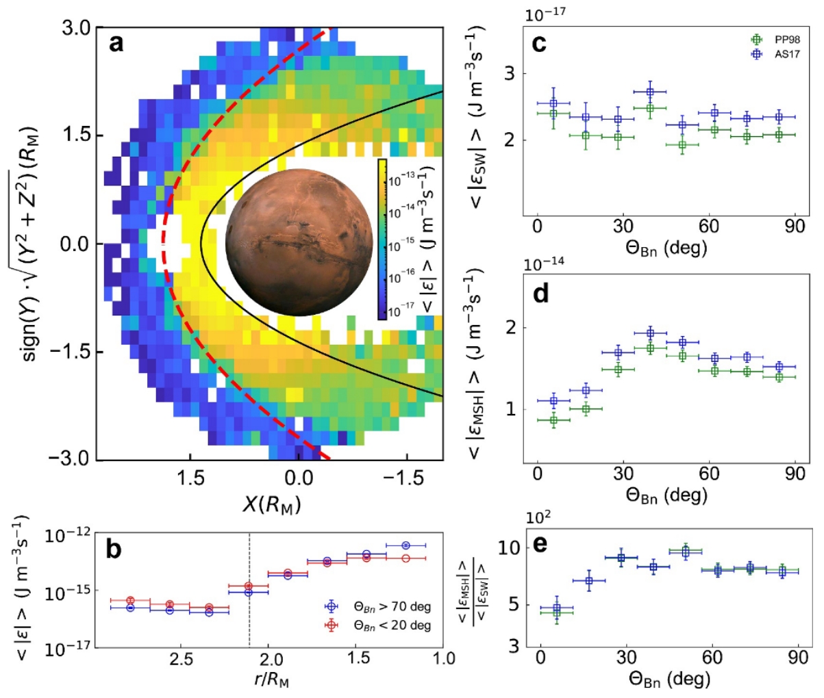 图2,(a)火星弓激波上下游太阳风湍流能量串级率的空间分布图。(b)太阳风湍流能量串级率随离火星距离的分布。(c-e)弓激波上游、下游太阳风湍流能量串级率以及上下游比值随激波法向角的分布。