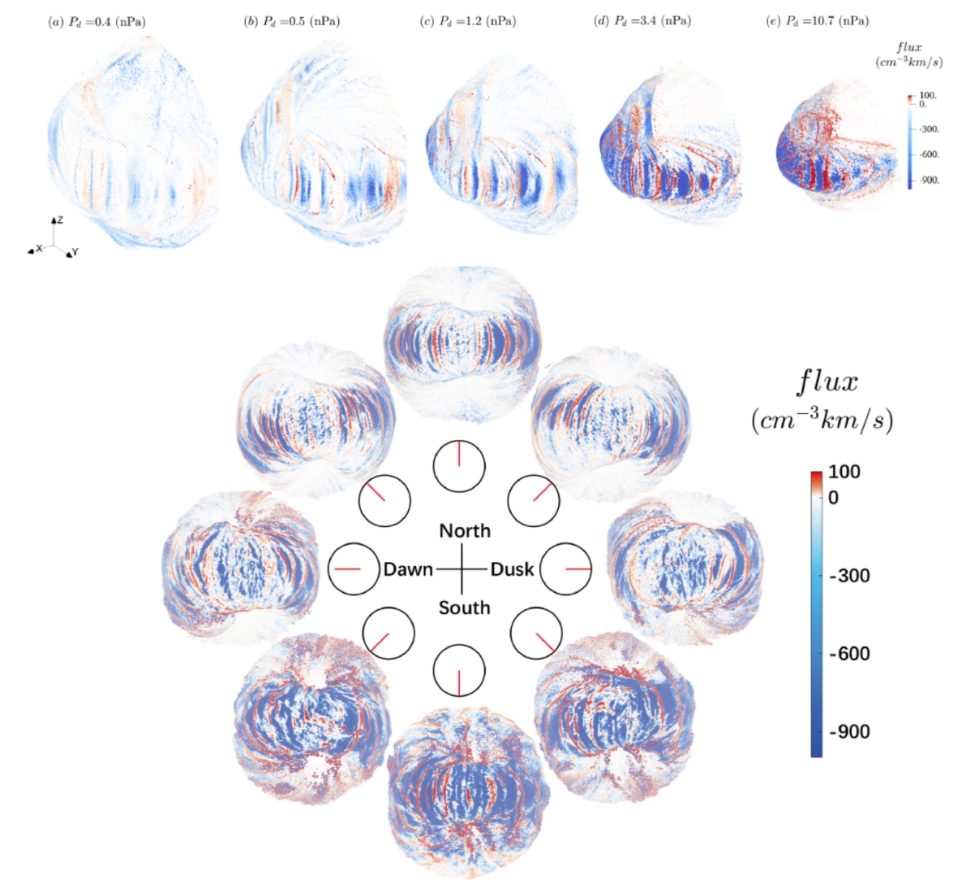 近日,太阳活动与空间天气重点实验室王赤院士团队的杨忠炜研究员、郭孝城研究员联合中国科学院地质与地球物理研究所、芬兰赫尔辛基大学FMI等单位的合作者,基于全球混合模拟,从动理学视角出发跟踪太阳风和行星粒子,首次定量分析了三维边界层的不同扇区内太阳风和行星粒子的混淆度(Mixing rate),并实现了对开尔文—亥姆霍兹不稳定性和磁场重联等结构调制下的任意非稳态磁层顶廓线的自动识别(图1)。研究发现,当IMF存在By分量时,我们模拟得到的“S”形KH区域与以往的磁流体模拟和卫星观测(Farrugia et al., 1998;Foullon et al., 2008)符合较好;在北向IMF条件下,穿越日侧磁层顶的粒子通量随太阳风动压增大而增加,并在KH区域达到峰值。与此同时,KH调制的低纬边界层会随动压增大而逐渐变薄;在南向IMF条件下,磁重联通过与KH结构的耦合,进一步增强了太阳风粒子的注入和日侧磁层离子的逃逸。尤其在日下点中低维度区域,这种效应最为显著(图2)。这些结果有助于进一步理解日球层及更广阔宇宙中磁化行星空间环境的演化以及物质输运机制;建立的自动识别磁层顶等边界层的混淆度方法,为SMILE软X射线图像识别AI训练提供了多种太阳风条件下的磁层顶位置和形态的训练集。