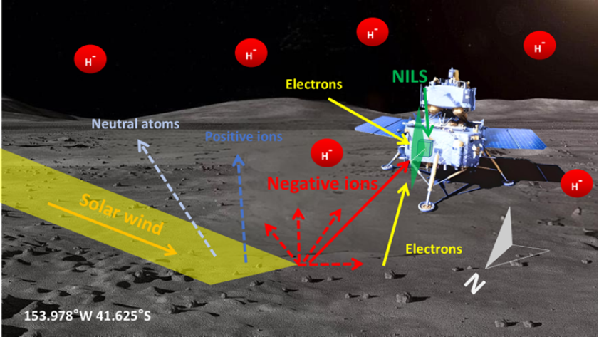月球是无大气天体代表,太阳风可直接轰击月表。近年来研究结果表明,太阳风质子打到月壤后,大部分被注入风化层中,约10%–20%以能量中性原子(ENA)形式散射,约0.1%–1%以正离子形式反射。此外,理论和实验室研究还预期,部分质子可能在散射过程中捕获第二个电子形成负离子(H⁻)。然而,由于光致解吸作用,H⁻在太阳辐射下极易失去电子而消散,在1AU处的寿命仅约0.07秒,因此难以存活到环月轨道器高度,导致以往的月球轨道探测任务未能捕捉到负离子信号。而月表就位探测可以在负离子产生的源区附近直接测量,是突破这一瓶颈的关键手段。嫦娥六号着陆器上搭载了一台由瑞典空间物理研究所和中国科学院国家空间科学中心联合研制的负离子分析仪(NILS),这是国际首个地外空间专用负离子探测器,它在两天观测时间内获得了六段有效的H⁻能谱数据,实现了人类首次在月球表面对负离子的直接探测。