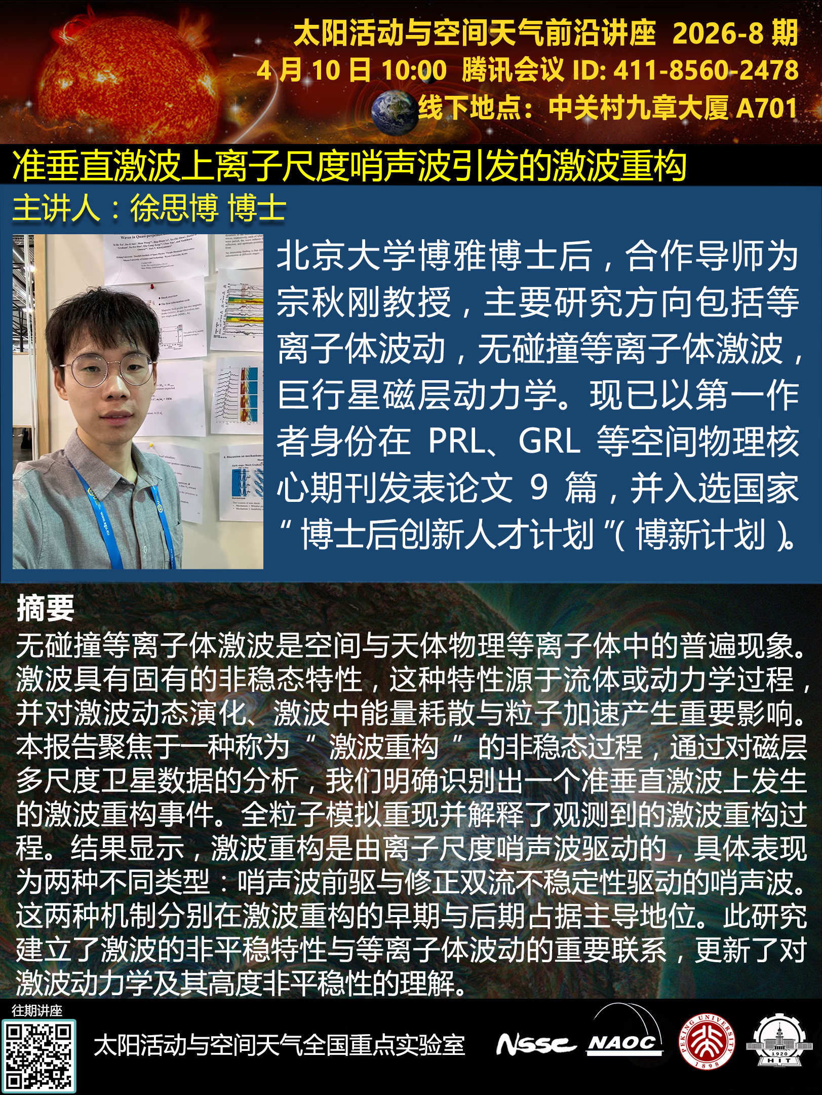 ![]() | 徐思博,北京大学博雅博士后,合作导师为宗秋刚教授,主要研究方向包括等离子体波动,无碰撞等离子体激波,巨行星磁层动力学。现已以第一作者身份在PRL、GRL等空间物理核心期刊发表论文9篇,并入选国家“博士后创新人才计划”(博新计划)。 |
