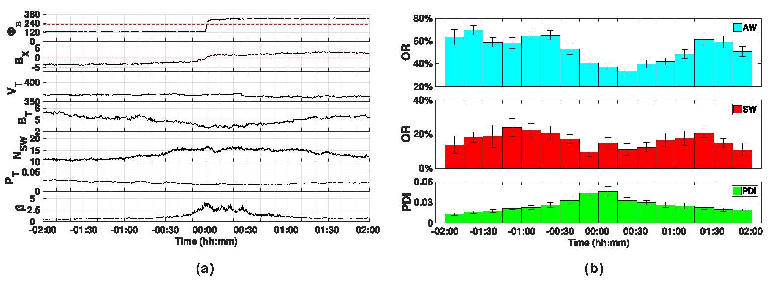 图1:HCS穿越伴随高β-HPS事件时序叠加分析图 左)Wind卫星穿越事件的观测;右)MHD波动的发生率分布