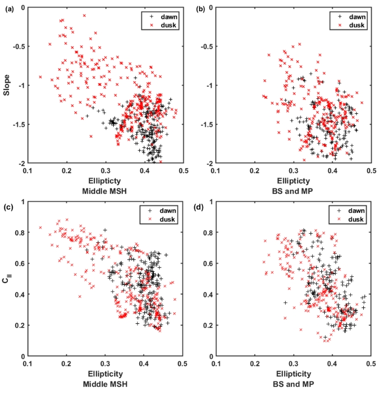 图2 椭度与湍流谱指数和磁场压缩性的分布关系。(a)和(b)分别代表在磁鞘中部和边界区域(弓激波和磁层顶附近)椭度与湍流谱指数的分布;类似的,(c)和(d)分别代表在磁鞘中部和边界区域椭度与磁场压缩性的分布。