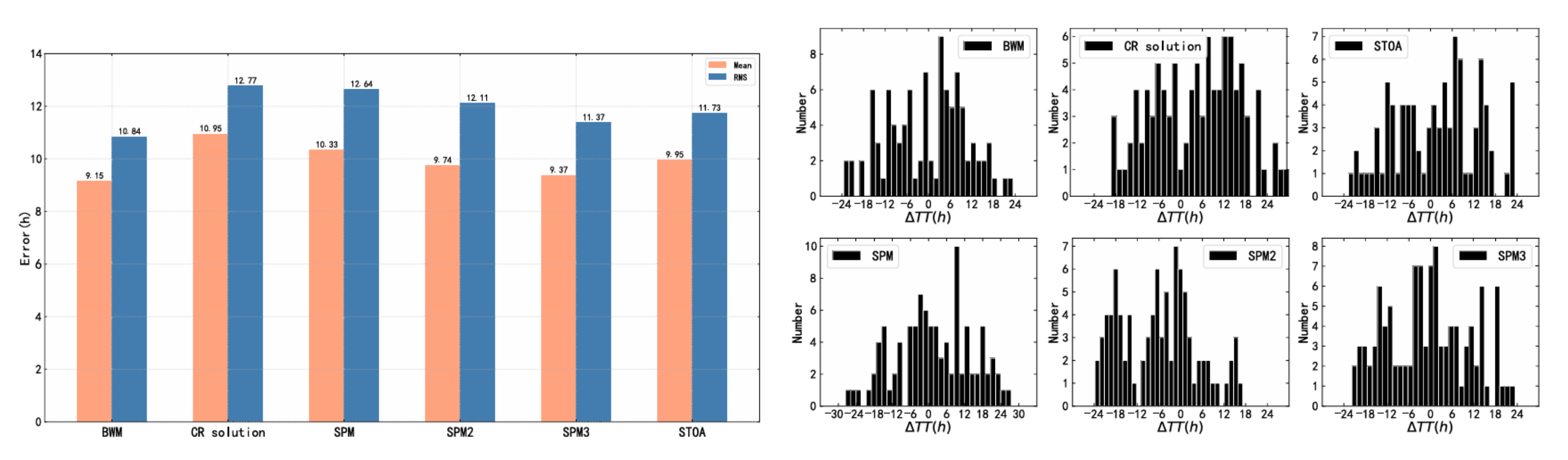 图3:BWM模型与各模型到达时间预报结果对比图:平均绝对误差及方均跟误差(左)、到达时间预报误差分布(右)