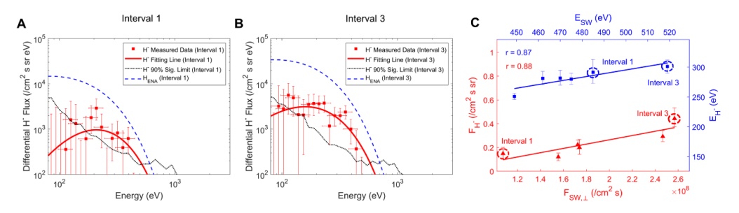 最近来自中国科学院国家空间科学中心的博士生仲天华、谢良海研究员、张爱兵研究员和王赤院士等人与国内外单位合作,将NILS获取的H⁻能谱与ARTEMIS卫星同期观测的上游太阳风参数进行了系统分析。结果显示,H⁻积分通量与太阳风法向通量之间存在强正相关(r=0.87),H⁻平均能量与太阳风能量同样呈强正相关(r=0.88)。太阳风通量最高时段的H⁻通量约为最低时段的三倍。这些结果为其起源于太阳风与月表相互作用提供了直接观测证据。此外,H⁻平均能量集中在250–300 eV,说明这些负离子主要由太阳风在月表的散射过程产生。将H⁻能谱与ENA经验能谱对比还发现,H⁻在低能段通量相对更低,这与固体表面负离子出射的速度依赖性理论预测一致,即速度较低的负离子在离开表面时其电子具有更高概率隧穿回表面,导致负离子损失一个电子而被中性化。