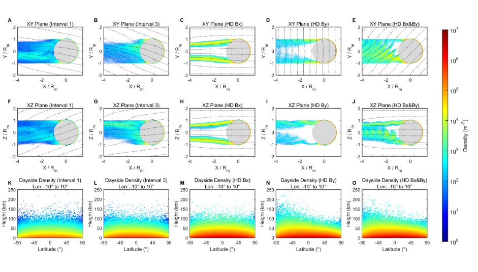 为评估H⁻对月球空间环境的影响,本研究进一步利用蒙特卡洛测试粒子模拟揭示了其空间分布特征。在向阳面,由于光致解吸效应,H⁻被限制在紧贴月球表面的薄层内,密度随高度迅速衰减,50公里以上降至10⁵ m⁻³以下。在背阳面,由于该区域处于月球阴影区内无太阳光照,光致解吸效应消失,H⁻被电磁场拾起后可形成延伸数个月球半径的长负离子尾。这一新发现的带电粒子组分可参与填充月球尾迹区的等离子体空腔。在极端太阳风密度事件期间,H⁻密度可比正常条件高出10倍以上,其可能对月球空间环境带来显著影响,比如产生一些等离子体波动等。