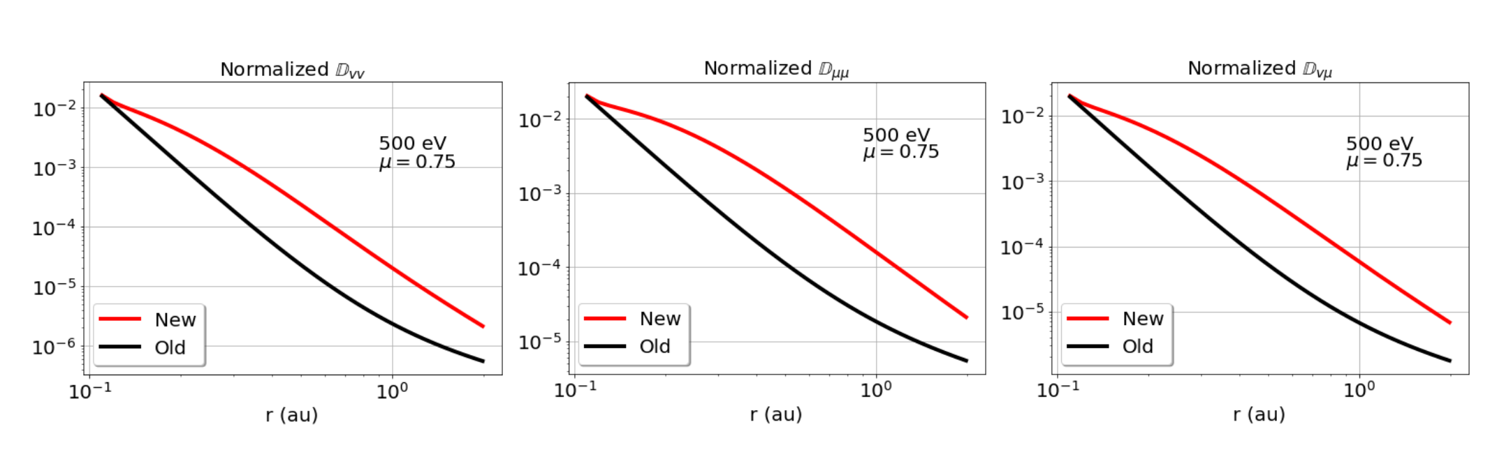图 1:从靠近太阳0.1个天文单位到远及2个天文单位,针对500电子伏特的电子,新旧扩散系数随日心距离的变化特征被清晰地展示和比较。