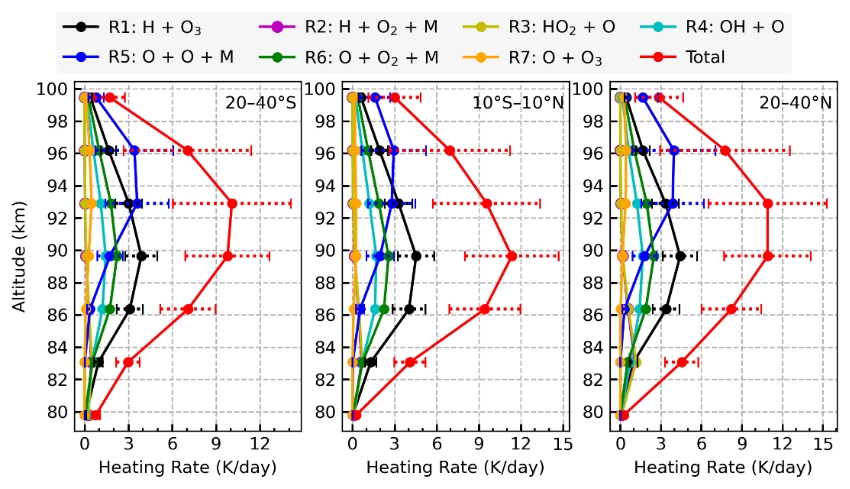 研究团队进一步将本工作反演结果与已有数据集进行了系统比对。结果显示,与基于SABER观测反演的加热速率相比,两组数据集在主要放热反应上仍存在显著的高度依赖性差异(图2),反映了不同仪器及反演方法所引入的系统性不确定度。