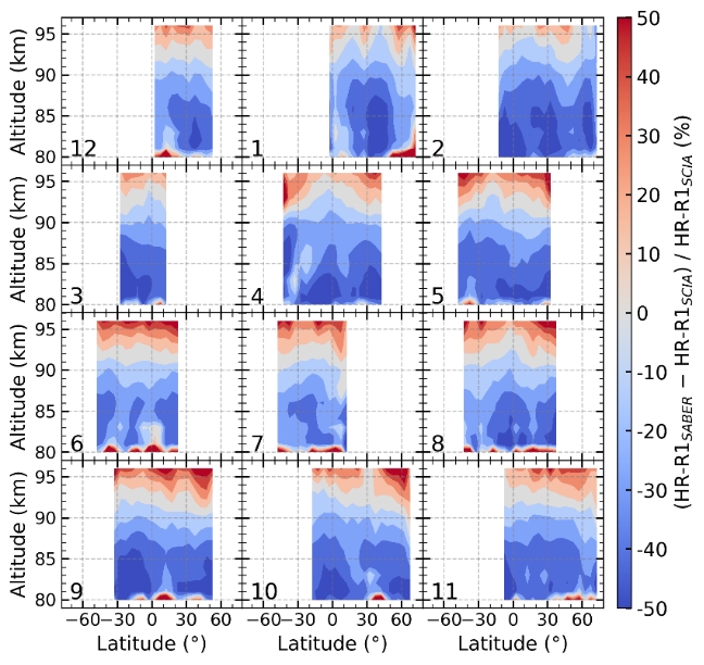 图2:基于SABER与SCIAMACHY反演的H+O3反应化学加热速率的百分比差异