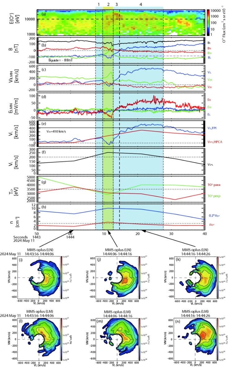 图1. 2024年5月超强磁暴期间MMS3卫星观测到富含能量O⁺离子的磁层顶磁重联离子扩散区。