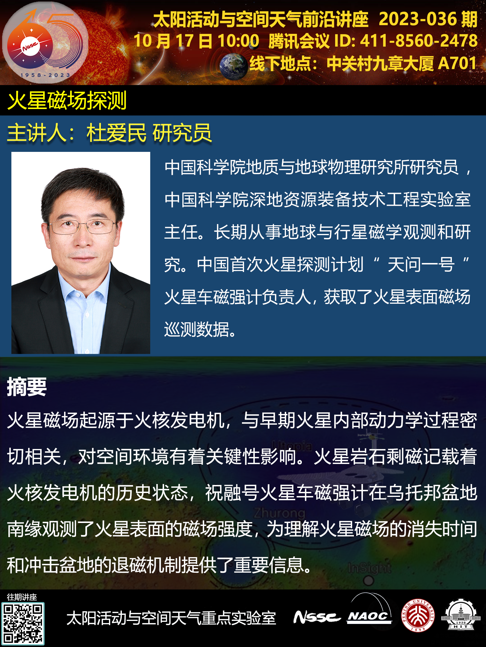 | 杜爱民,中国科学院地质与地球物理研究所研究员,中国科学院深地资源装备技术工程实验室主任。长期从事地球与行星磁学观测和研究。中国首次火星探测计划”天问一号“火星车磁强计负责人,获取了火星表面磁场巡测数据。 |