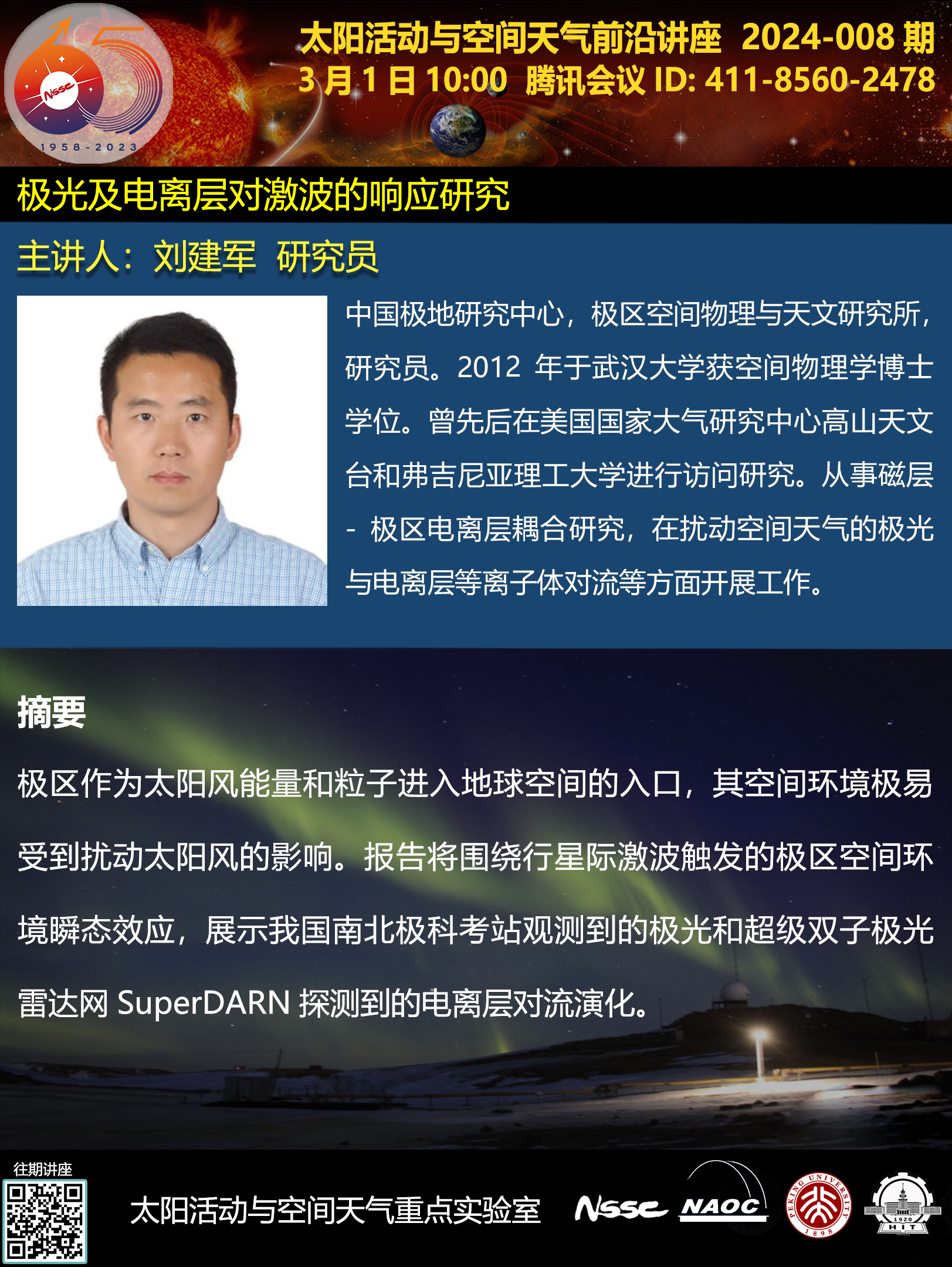 极区作为太阳风能量和粒子进入地球空间的入口,其空间环境极易受到扰动太阳风的影响。报告将围绕行星际激波触发的极区空间环境瞬态效应,展示我国南北极科考站观测到的极光和超级双子极光雷达网SuperDARN探测到的电离层对流演化。