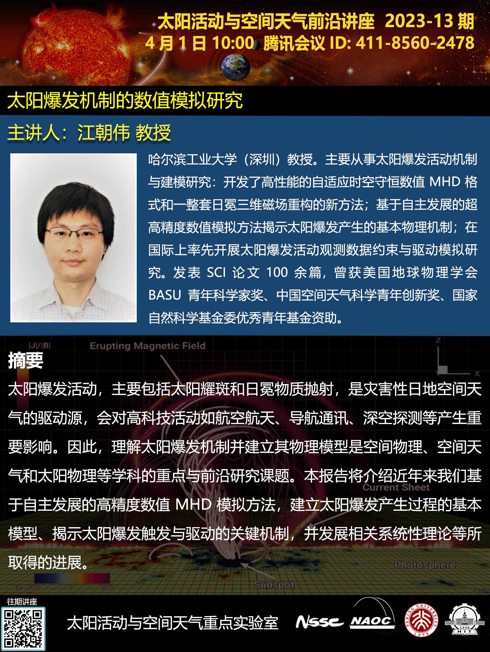 太阳爆发活动,主要包括太阳耀斑和日冕物质抛射,是灾害性日地空间天气的驱动源,会对高科技活动如航空航天、导航通讯、深空探测等产生重要影响。因此,理解太阳爆发机制并建立其物理模型是空间物理、空间天气和太阳物理等学科的重点与前沿研究课题。本报告将介绍近年来我们基于自主发展的高精度数值MHD模拟方法,建立太阳爆发产生过程的基本模型、揭示太阳爆发触发与驱动的关键机制,并发展相关系统性理论等所取得的进展。