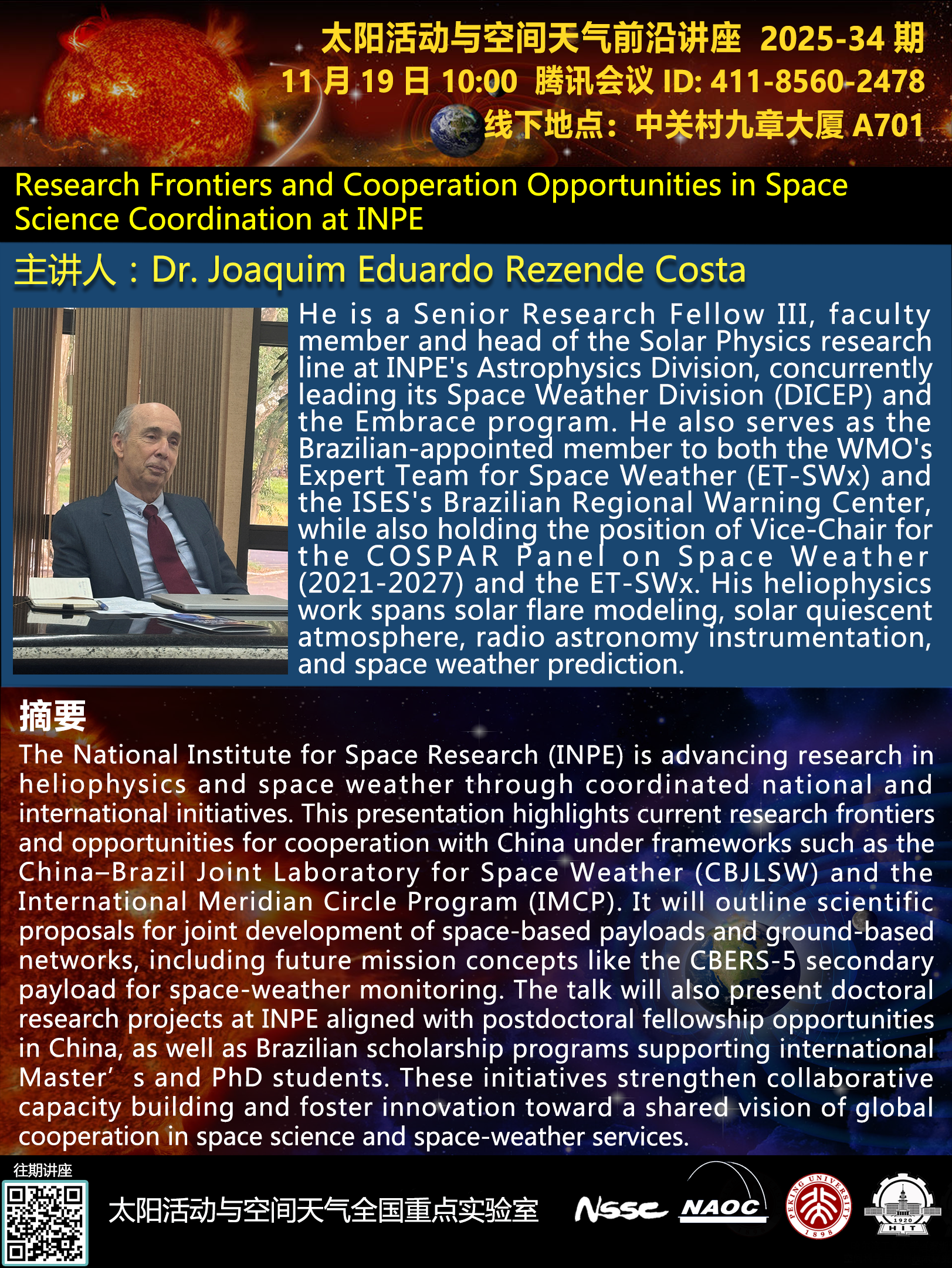 讲座题目:Research Frontiers and Cooperation Opportunities in Space Science Coordination at INPE