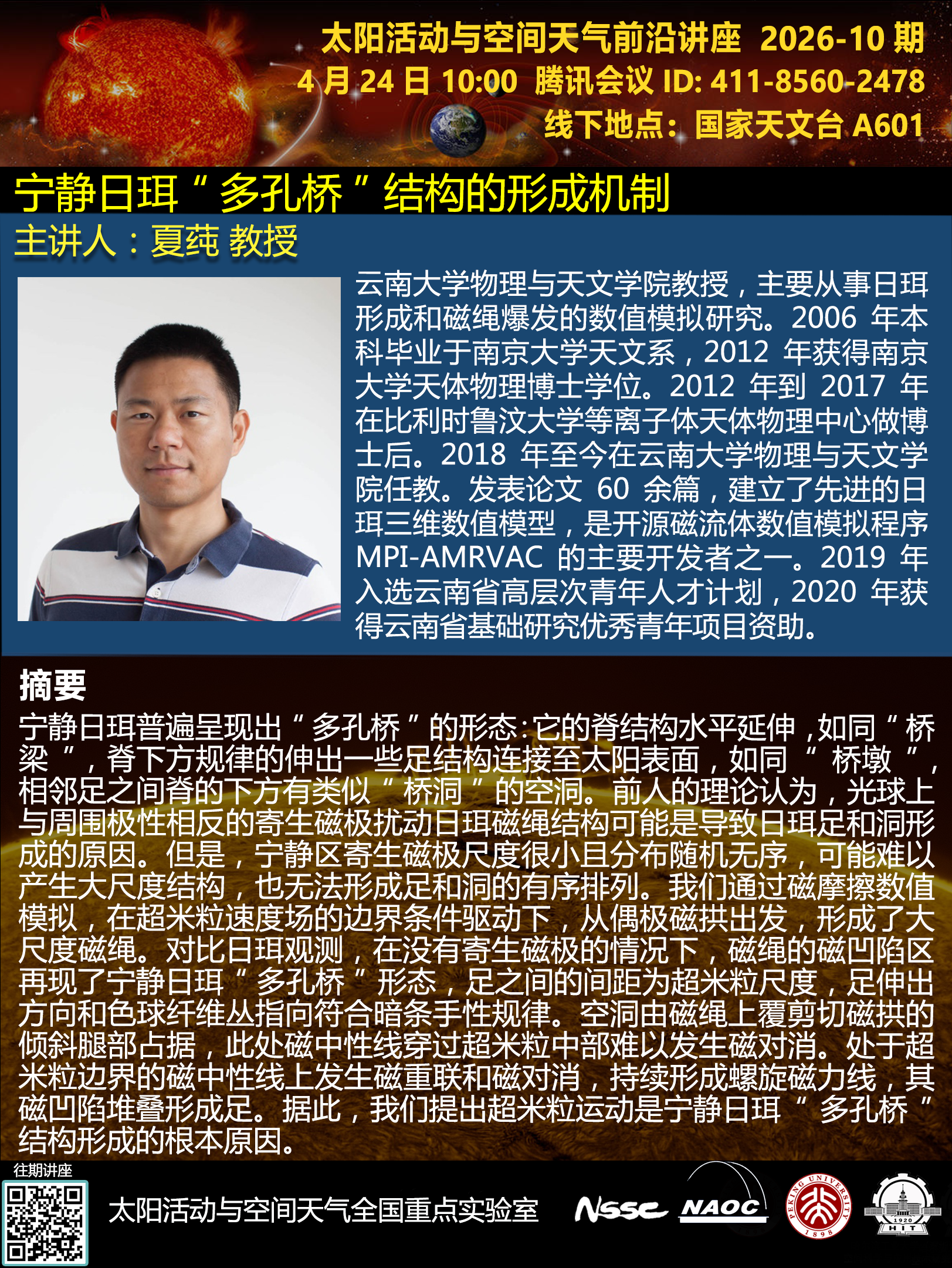 讲座题目:宁静日珥“多孔桥”结构的形成机制