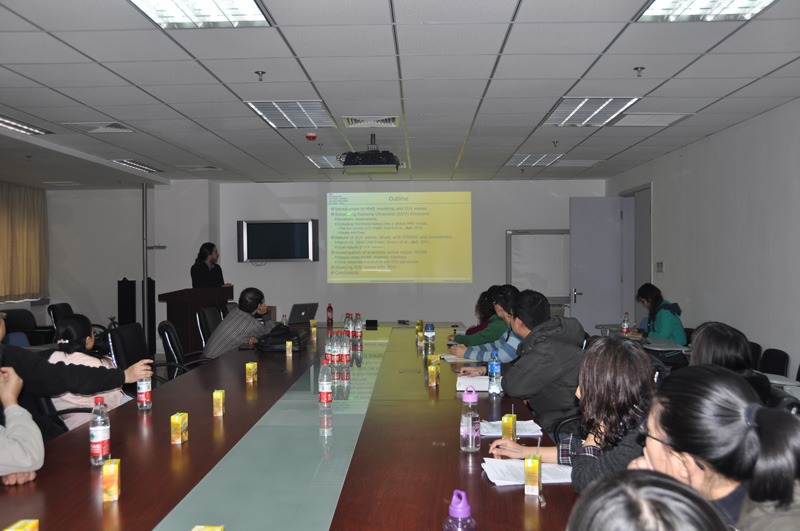 2月15日上午, Lugaz博士在空间天气学国家重点实验室作了题为“Combining Observations and Simulations to Advance our Understanding of Solar Eruptions, CME-CME Interaction and Complex Ejecta”的报告,实验室相关研究人员和研究生共20余人参加了报告会。Lugaz博士详细介绍了如何将观测与数值模拟相结合,以利于更好的理解太阳风暴、CME相互作用以及复杂抛射等事件。在报告中,Lugaz博士介绍了近年来,借助三维MHD数值模型,同时利用日冕及行星际空间的观测手段,如LASCO和SECCHI中的白光图像,在研究CME物理特性方面的一些进展。2月16日上午,他继续做了题为“Studying EUV Waves with a Digital Laboratory”的学术报告。报告中,Lugaz博士重点讲述了如何在MHD模拟中引入加热项,从而通过模拟来进一步理解与解释EUV波的传播特性。两场报告会内容丰富、深刻,引起了大家的极大兴趣,现场讨论气氛十分热烈。会后,Lugaz博士又与到会科研人员和研究生就三维MHD数值模拟现状及未来发展趋势进行了深入探讨和交流。访问期间,在实验室副主任冯学尚研究员的陪同下,Lugaz还参观了子午工程多功能演示大厅,以及空间环境检测系统,对实验室先进的设备以及相关科研工作称赞不已。